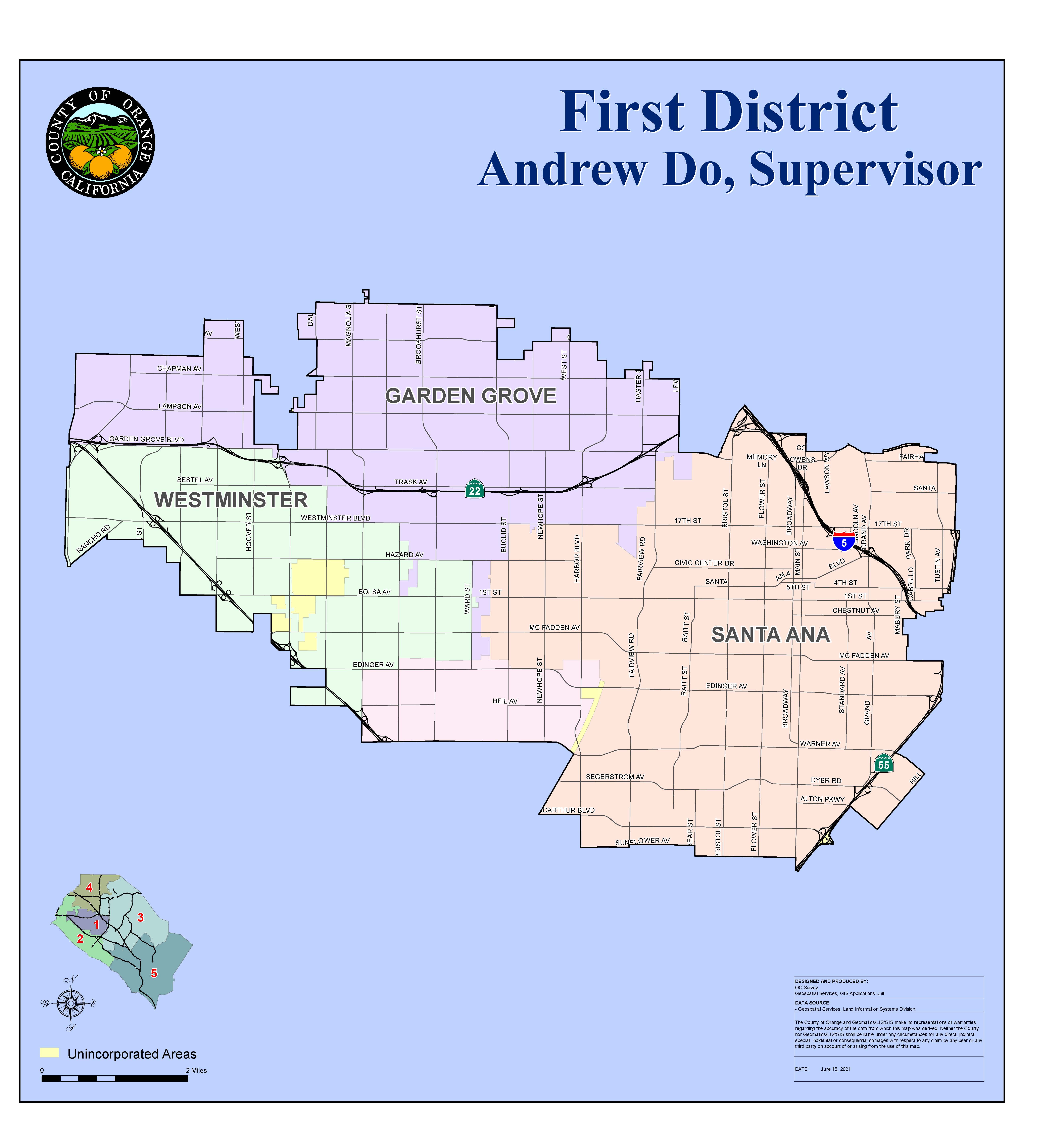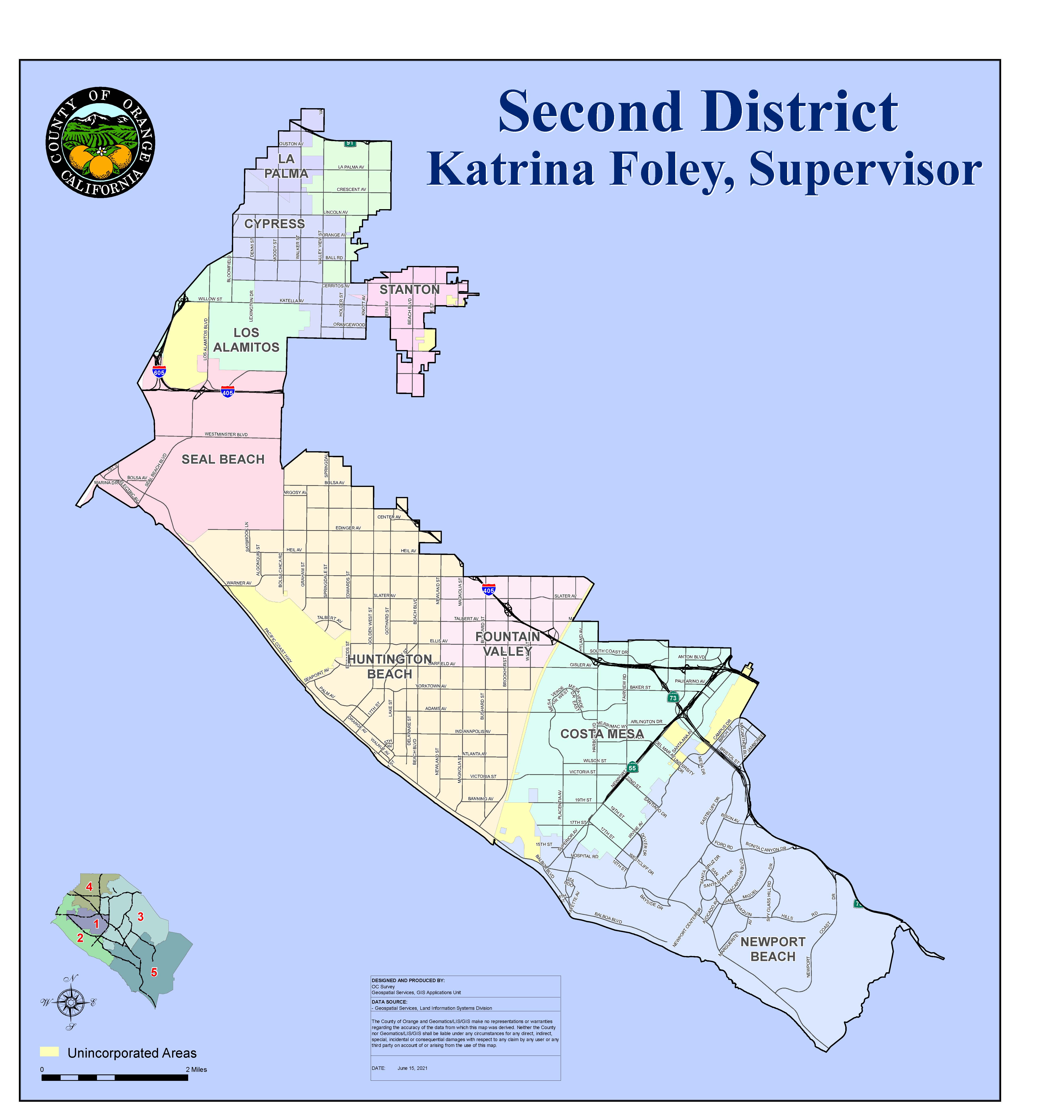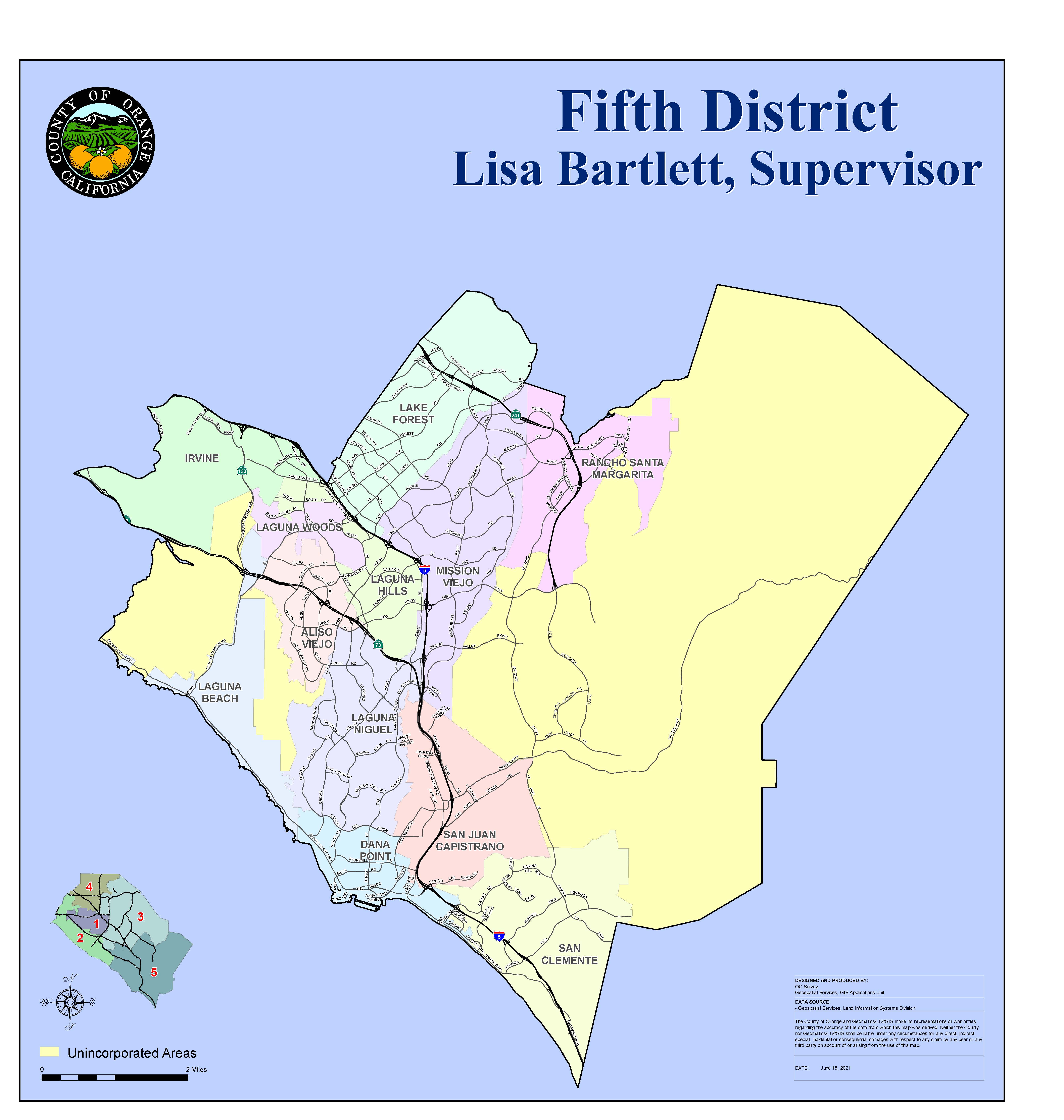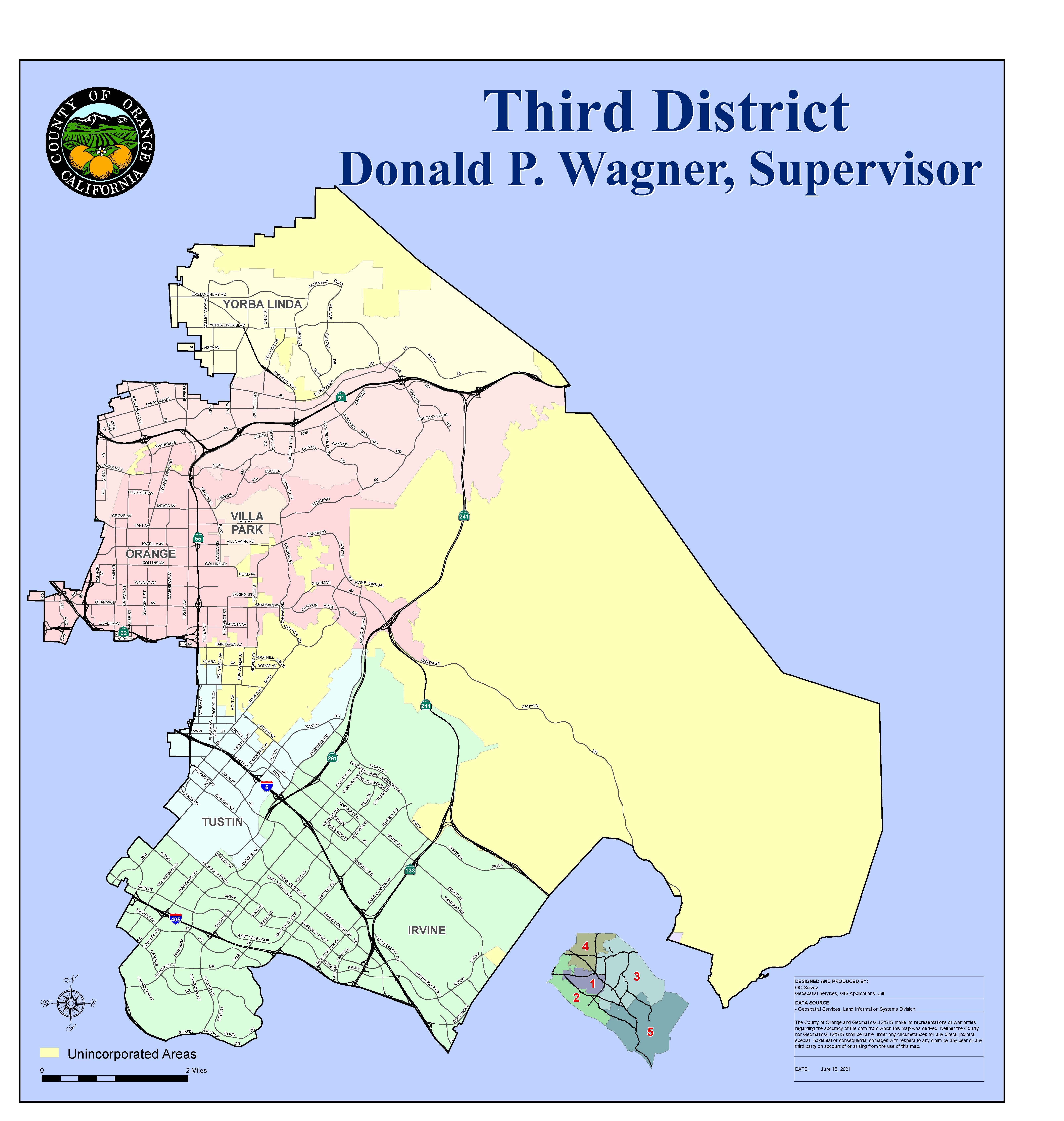 Every ten years, supervisorial districts must be redrawn so that each district is substantially equal in population. This process, called redistricting, is important in ensuring that each board member represents about the same number of constituents. In Orange County, the Board of Supervisors is responsible for drawing supervisorial districts. Redistricting is done using U.S. Census data, which is normally released by March 31, 2021, but the U.S. Census Bureau has indicated there is a delay due to the COVID-19 pandemic and the data will be released by September 30, 2021. For the County of Orange, the redistricting process must be completed by December 15, 2021.