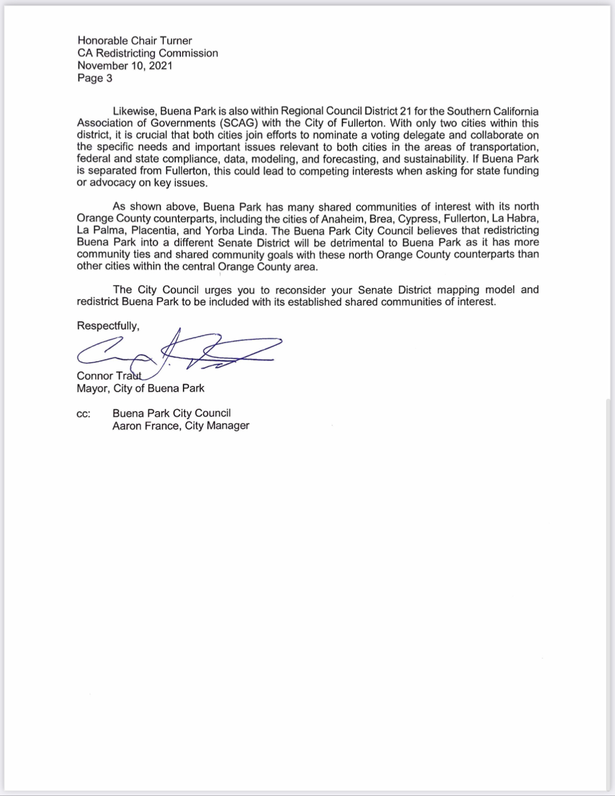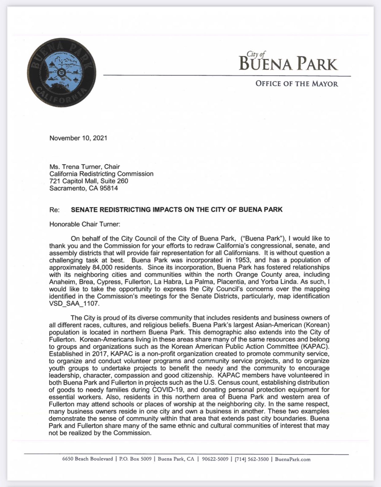 | 11/12/2021 | Thomas Lee | Korean American Public Action Committee | I am a member of KAPAC, Korean American Public Action Committee. The attached letter from the City of Buena Park was being circulated among our 473 members, who are very active in the Orange County community. It was well-received by KAPAC members. PDF 1 / PDF 2 / PDF 3 Although this letter was written by the City Council Members of Buena Park in the context regarding the senate redistricting issue, the same rationale applies to the Map 2 of the OC Supervisors are now considering. Map 2 separates Buena Park from Fullerton and other North Orange County cities. It is completely against the rule under the community of interest. Please carefully review the letter from the City of Buena Park as Map 2 is not good for the community at large. Thank you. |