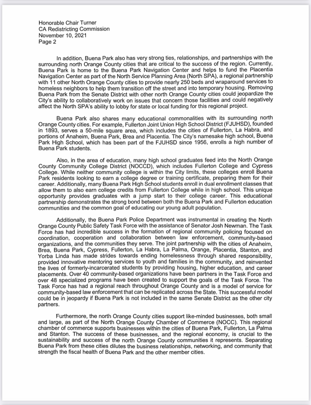 We strongly urge you to include both cities of Buena Park and Fullerton in one County District.